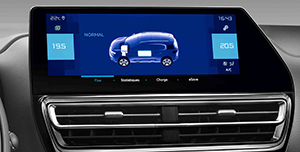- 10 colių jutikliniame ekrane pateikiama informacija apie aktyvuotą režimą, taip pat išankstinio įkrovimo, salono pašildymo ir e-save funkcijų parinktys. Pastaroji technologija leidžia išsaugoti elektros energiją ir vėliau įveikti numatytą maršrutą 100 proc. elektros režimu.