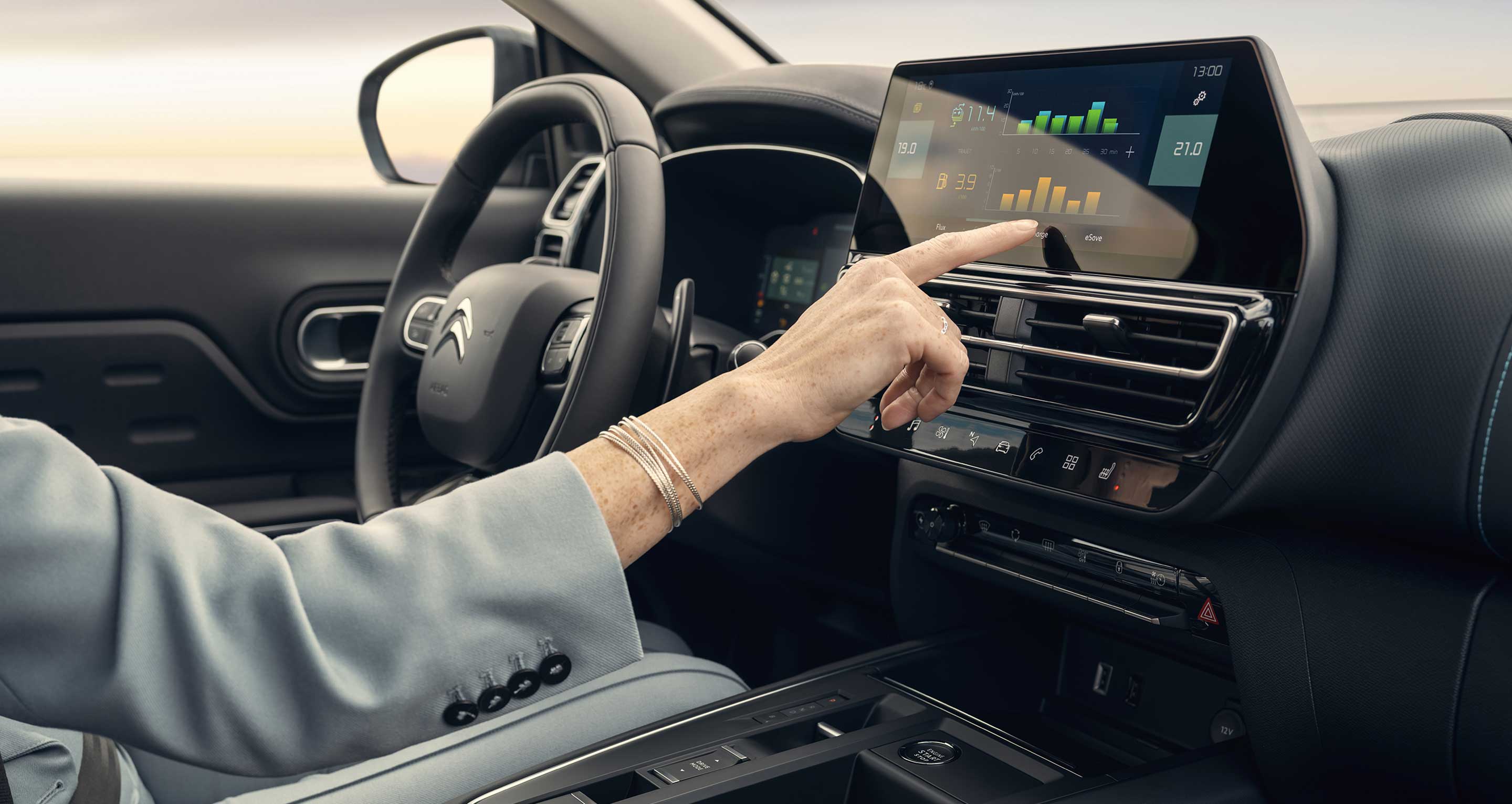 Naujajame Citroën C5 Aircross montuojamas 10 colių jutiklinis ekranas yra dar patogesnis. Jame galima keisti klimato kontrolės parinktis, o dėl lengviau įžiūrimų ženklų ir rašmenų daugiau nebereikės nuleisti akių nuo kelio. Oro tiekimo angos perkeltos po ekranu. Taip pat pakeista ir jų forma – horizontalios angos atrodo elegantiškiau.
