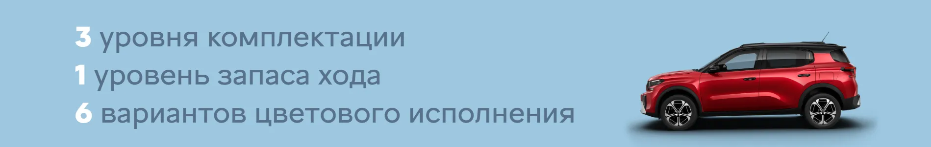 Встречайте нового члена семьи Citroën! Citroën C3 Aircross теперь доступен в полностью электрической версии наряду с бензиновым Petrol 100 и гибридным Hybrid 136. Совершенно новый C3 Aircross — семейный кроссовер, созданный, чтобы стать идеальным компаньоном для семей и людей, ведущих активный образ жизни. Благодаря сочетанию модульности и надежности, этот универсальный автомобиль способен удовлетворить любые ваши потребности.