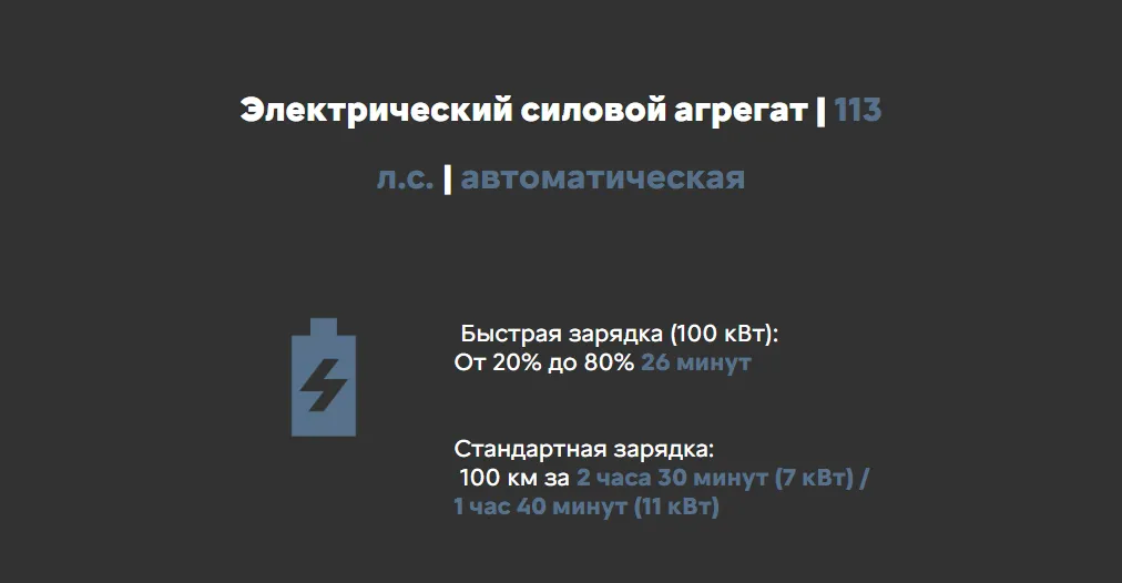 Электродвигатель мощностью 113 л.с. / 83 кВт идеально подходит как для ежедневных поездок на работу, так и для длительных путешествий. Аккумулятор емкостью 44 кВт⋅ч обеспечивает запас хода 300 км* (ожидается омологация по циклу WLTP).